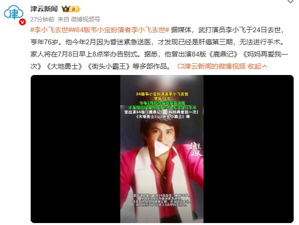 据媒体,武打演员李小飞于24日去世,亨年76岁。他今年2月因为昏迷紧急送医,才发现已经是肝癌第三期,无法进行手术。家人将在7月8日早上8点举办告别式。据悉,他曾出演84版《鹿鼎记》《妈妈再爱我一次》《大地勇士》《街头小霸王》等多部作品。